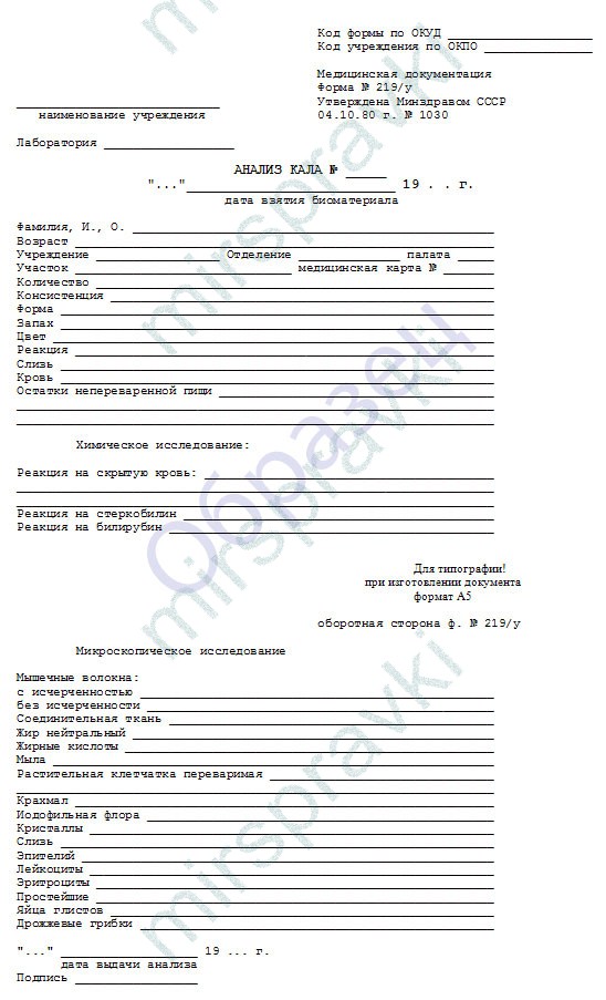 Общий анализ кала форма 219/у