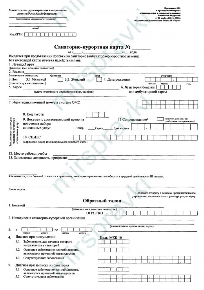 Справка 072/у санаторно-курортная карта